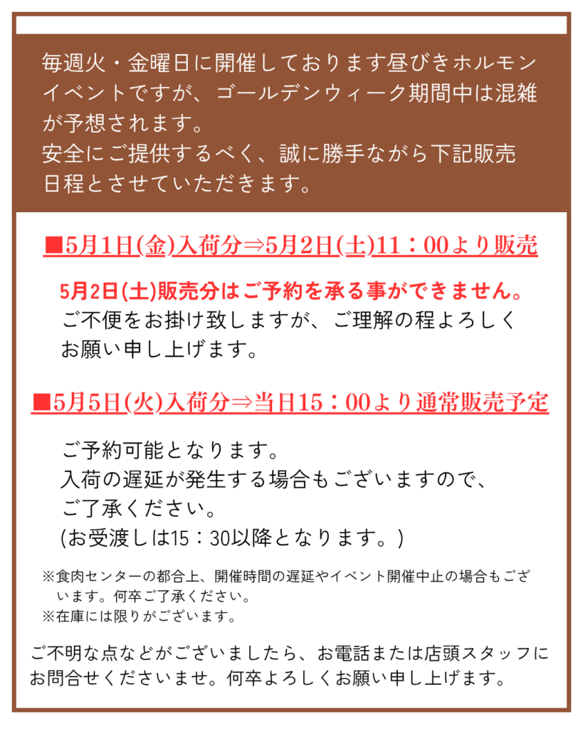 ゴールデンウィーク期間中のホルモン販売についてのお知らせです。