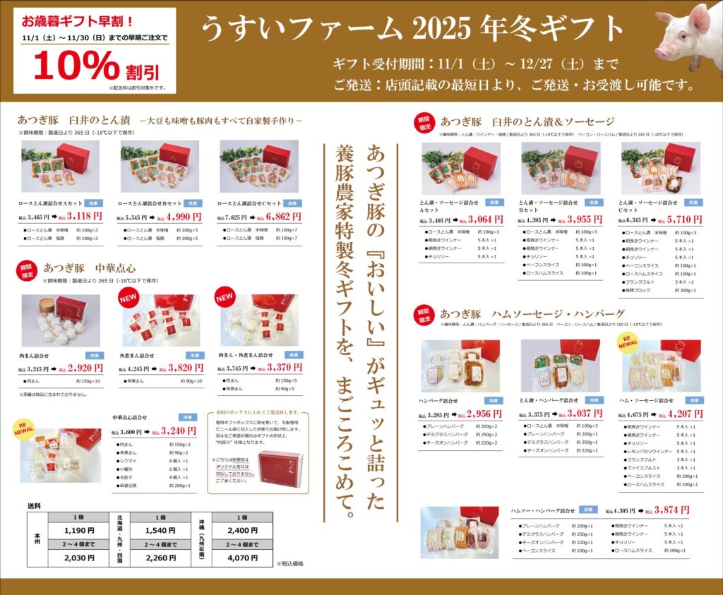 うすいファームでは11月1日(土)より、店頭にてあつぎ豚特製冬ギフトのご注文受付を開始いたします。