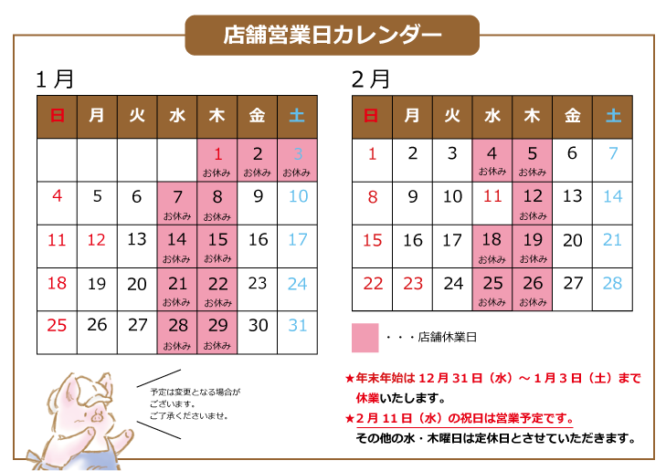 2026年1月~2月の営業日についてお知らせいたします。
