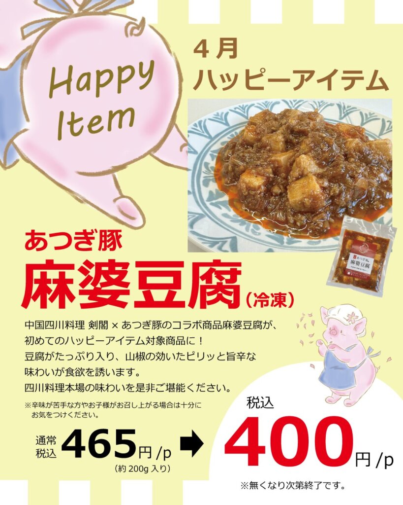 中国四川料理 剣閣×あつぎ豚のコラボ商品『麻婆豆腐』が、初めてハッピーアイテム対象商品に!